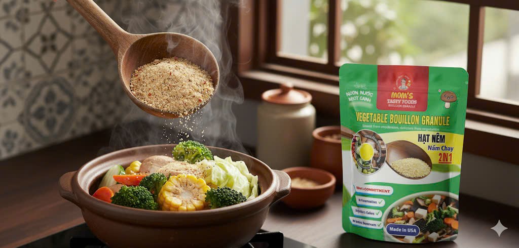 Mom’s Tasty Food Vegetable Bouillon Granule is crafted to bring out the natural sweetness of vegetables and mushrooms, creating a clean and comforting flavor perfect for everyday cooking. Inspired by traditional Vietnamese home kitchens, this bouillon adds depth without overpowering your dish.